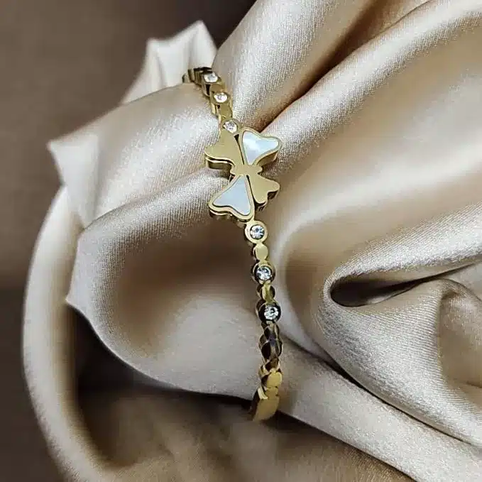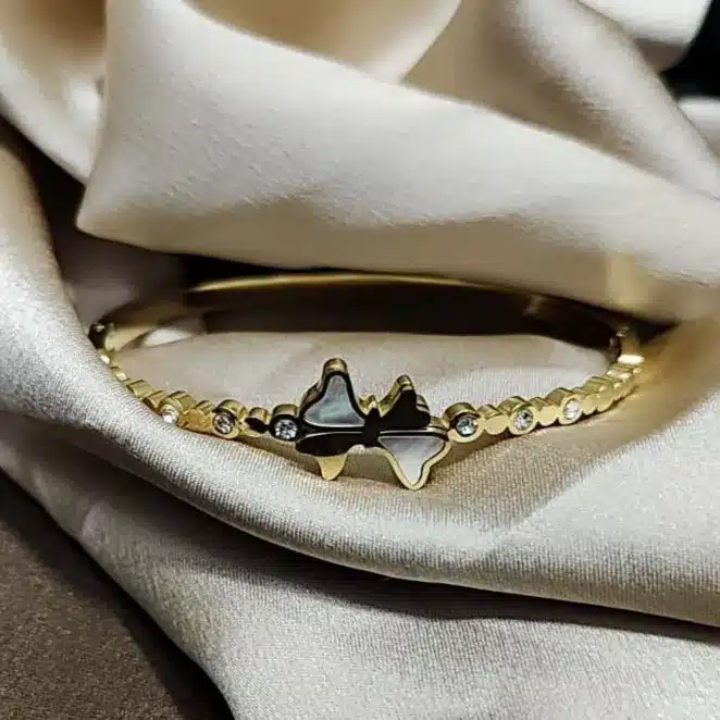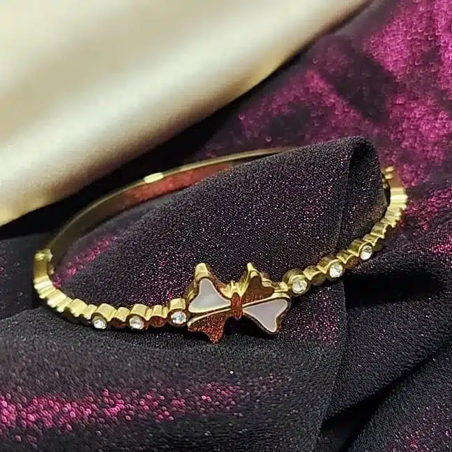 Delicate, dazzling, and effortlessly chic — our Bow Style Studded Look Anti-Tarnish Bracelet is a true statement of refined elegance. Crafted with precision, this bracelet features a beautifully sculpted golden bow centerpiece symbolizing femininity and style. The sleek metallic band is enhanced with finely placed sparkling stones, adding just the right amount of shine to your wrist.