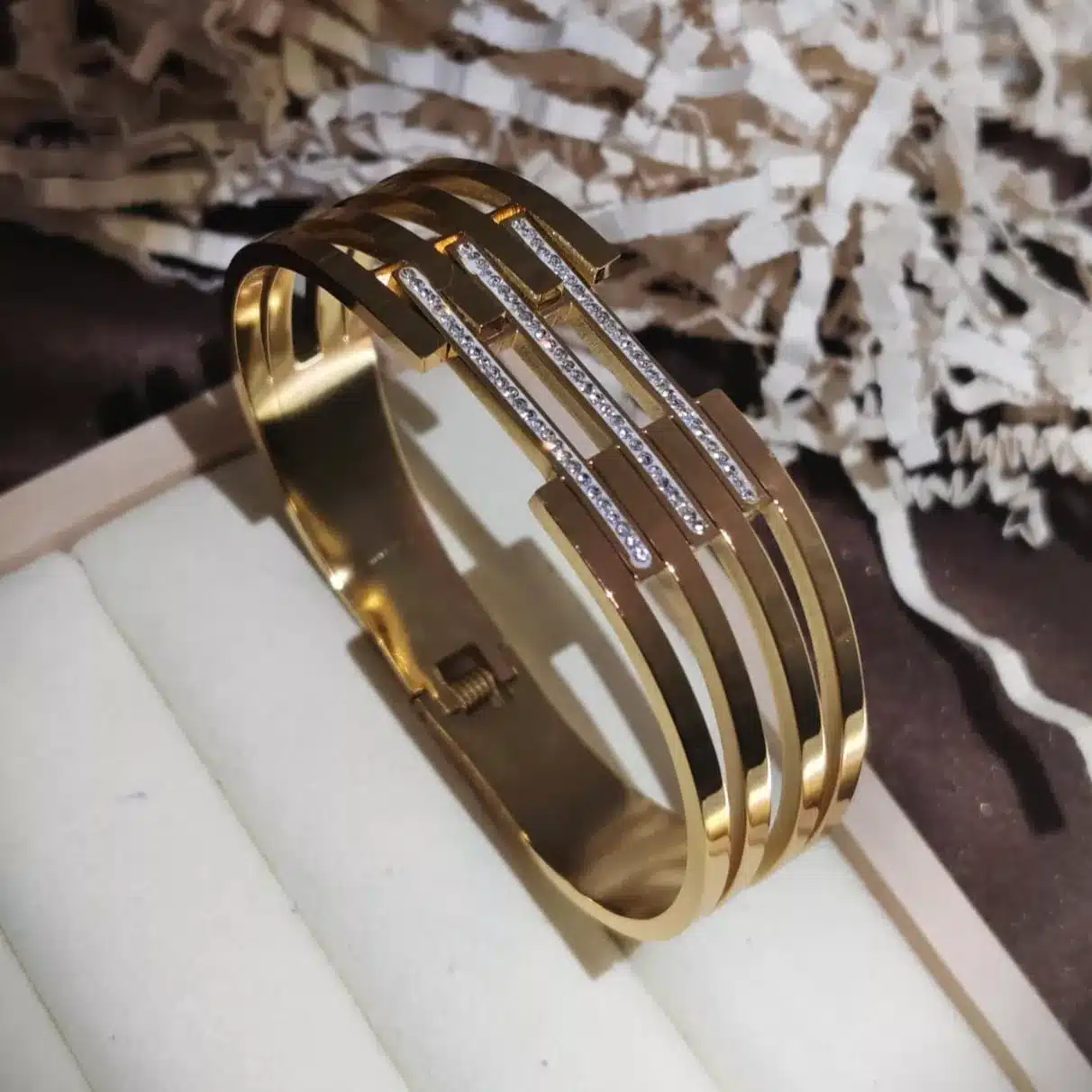 The multi-band design is structured and contemporary, giving the piece substantial presence. It is secured by a sturdy, discrete box clasp, often with a hinge mechanism, ensuring the rigid bangle can be comfortably slipped over the wrist and secured safely. Crucially, this piece is made for longevity, boasting excellent anti-tarnish and waterproof qualities. This makes it an ideal choice for hassle-free daily wear, ensuring its luxurious shine and brilliance withstand the rigors of an active lifestyle without requiring frequent maintenance.