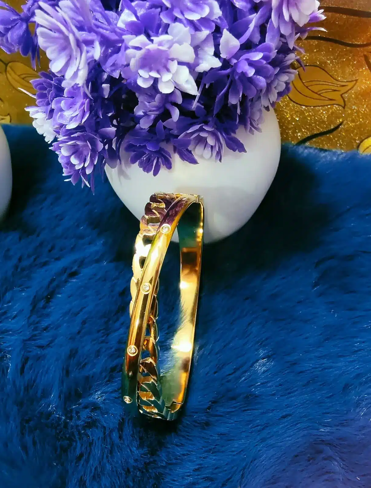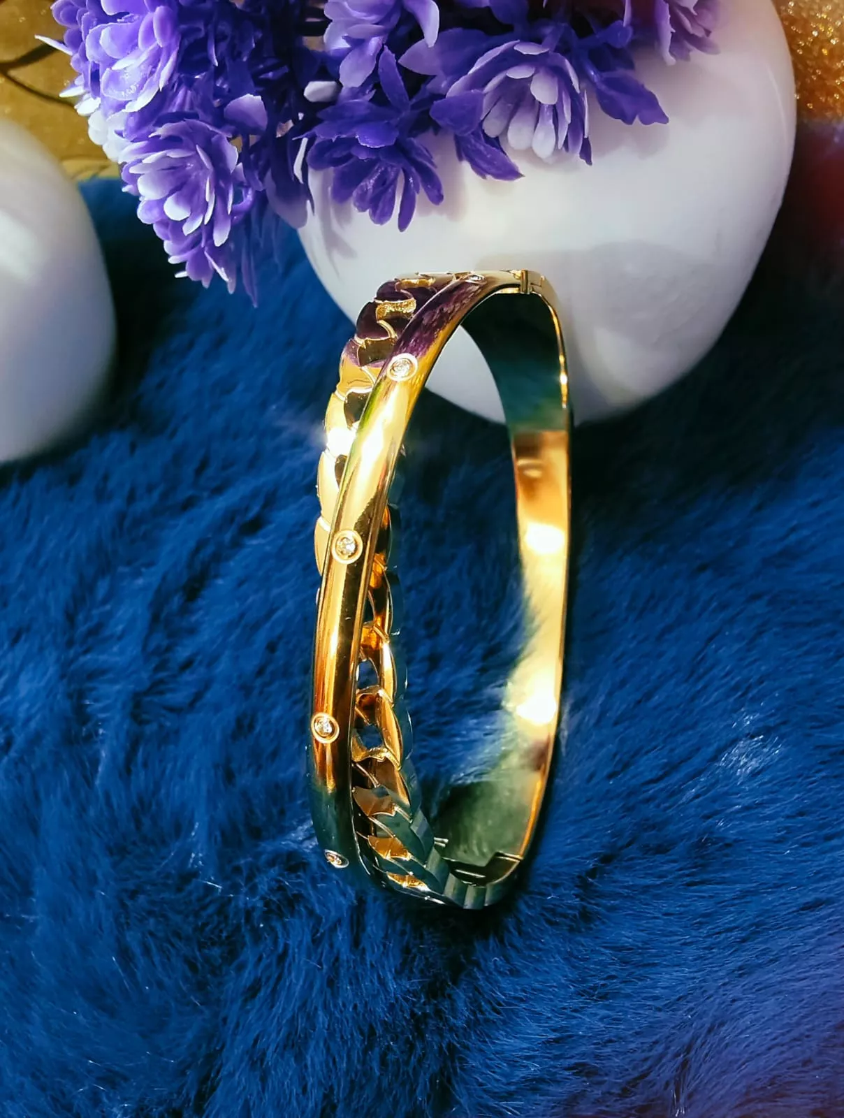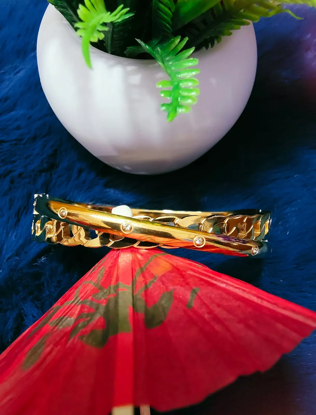This intriguing gold-tone bangle stands out as a different design bracelet, perfectly merging contrasting textures for a modern and sophisticated aesthetic. The rigid, polished gold band is split into two distinct visual halves. One side offers a sleek, highly reflective surface, providing a contemporary foundation for the piece. The other half is cleverly designed to mimic a chunky curb chain, giving the illusion of two distinct bracelets fused together.
