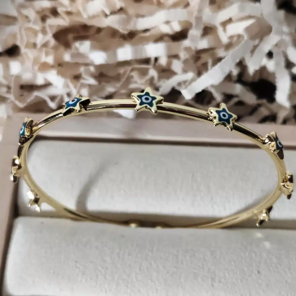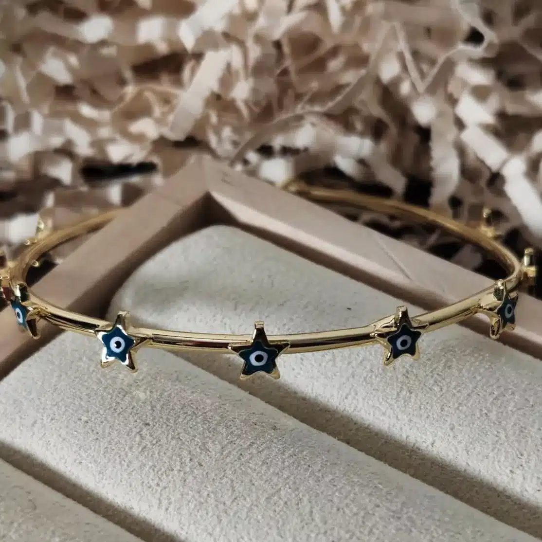 This unique gold-tone bangle offers a stylish and meaningful take on protective jewelry, combining the playful look of stars with the powerful symbolism of the Evil Eye. The bracelet features a slender, polished gold-tone band designed to be slipped over the wrist, securing comfortably. The bangle is studded along its entire circumference with small, intricate star-shaped charms. Each star is meticulously detailed, with a miniature Evil Eye design painted in the center using blue and black enamel, providing a vibrant contrast against the warm gold metal.