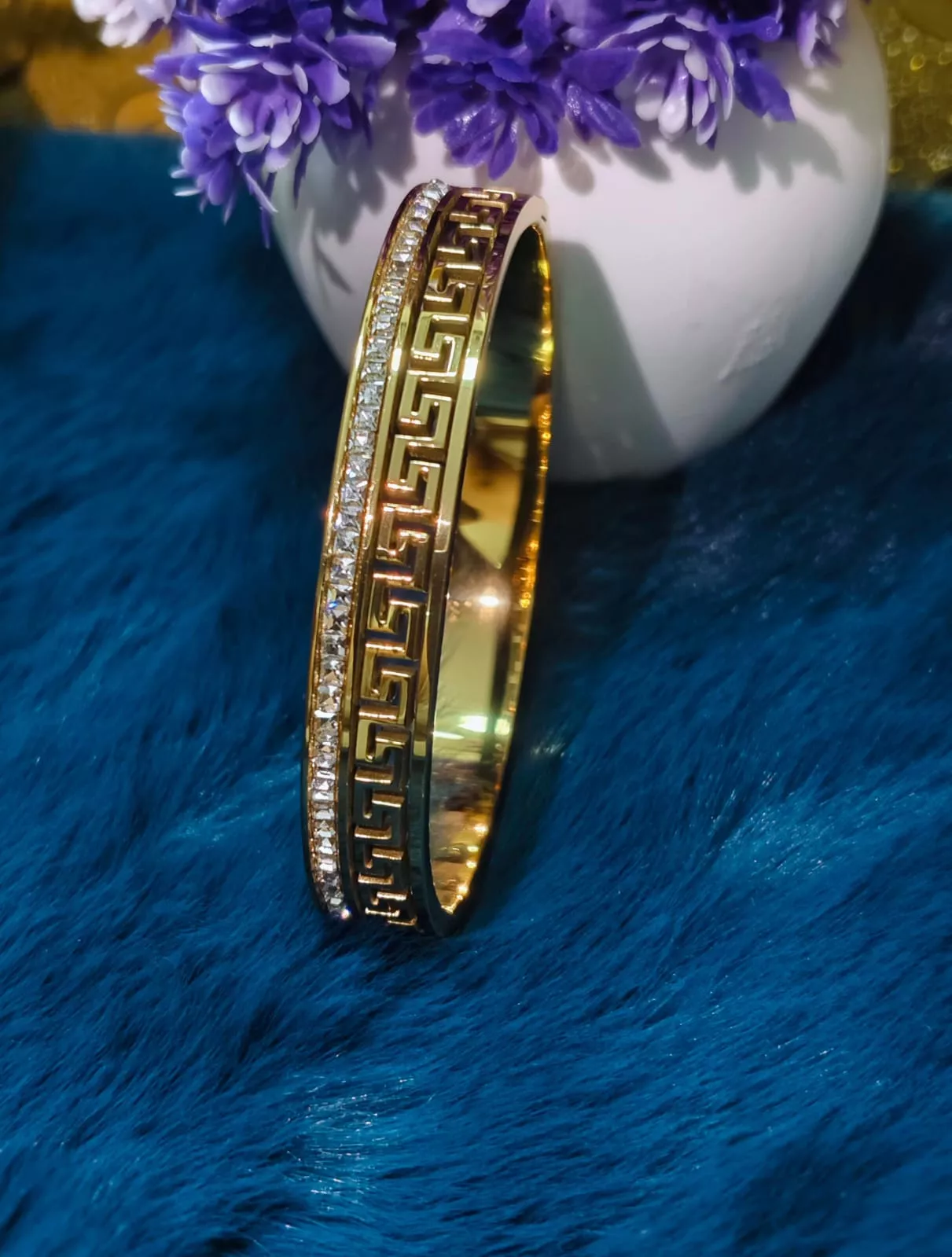 The sturdy, fixed-shape bangle is secured by a discrete clasp mechanism, ensuring comfortable and reliable wear. Constructed from durable materials, this piece is highly resilient, offering essential anti-tarnish and waterproof qualities. This guarantees that its luxurious shine and detailed design will remain pristine, making it a perfect, hassle-free accessory for daily wear or special occasions.